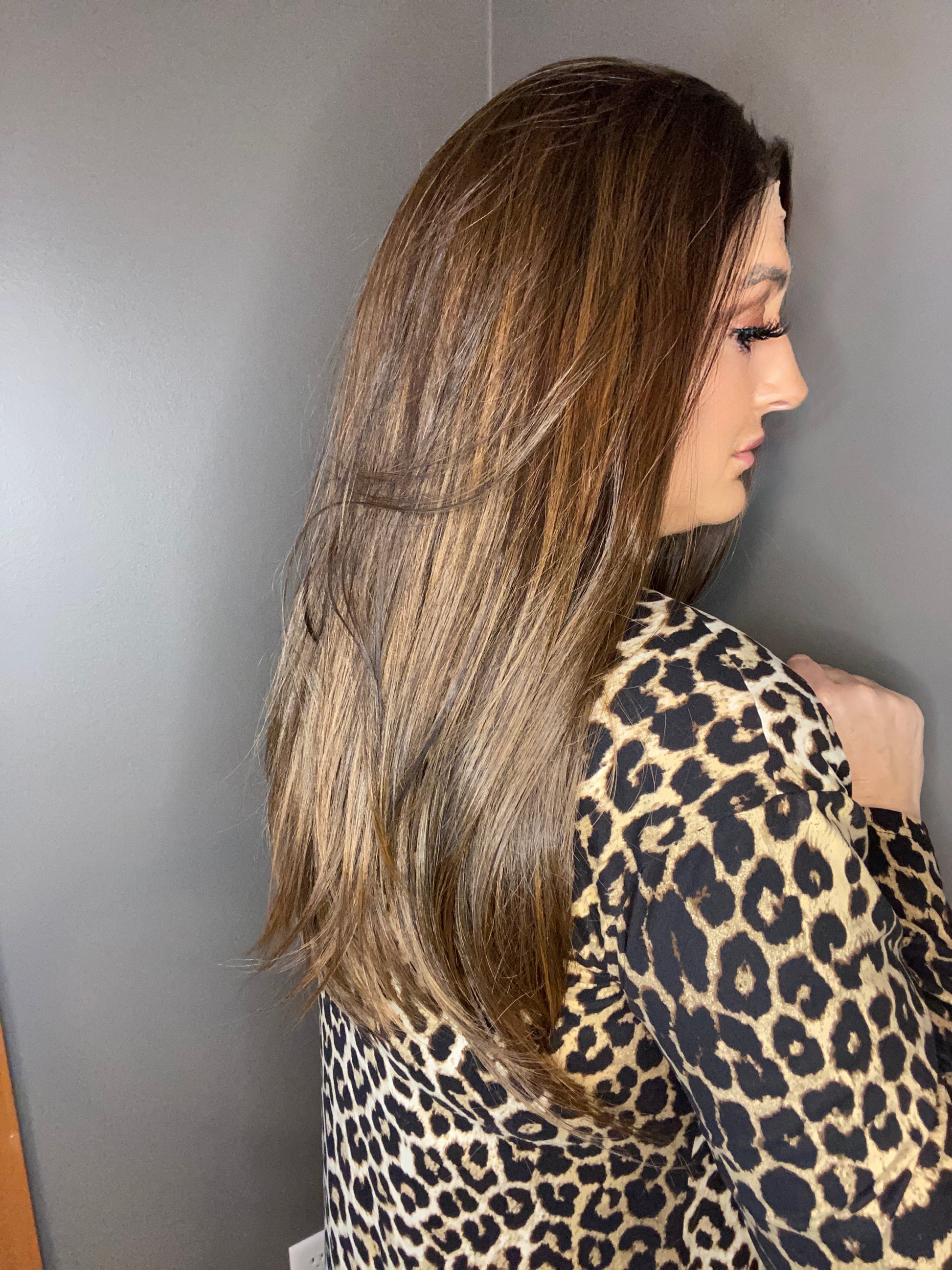 Rich pecan brownie brown, soft long layers throughout. 24 inches, heat friendly synthe Fiber up to 325 degrees. Please always test a strand first. 140% density, 13x4 lace front, closed weft with adjustable straps and added inner combs for security. Fits average head size up to 22 inches.