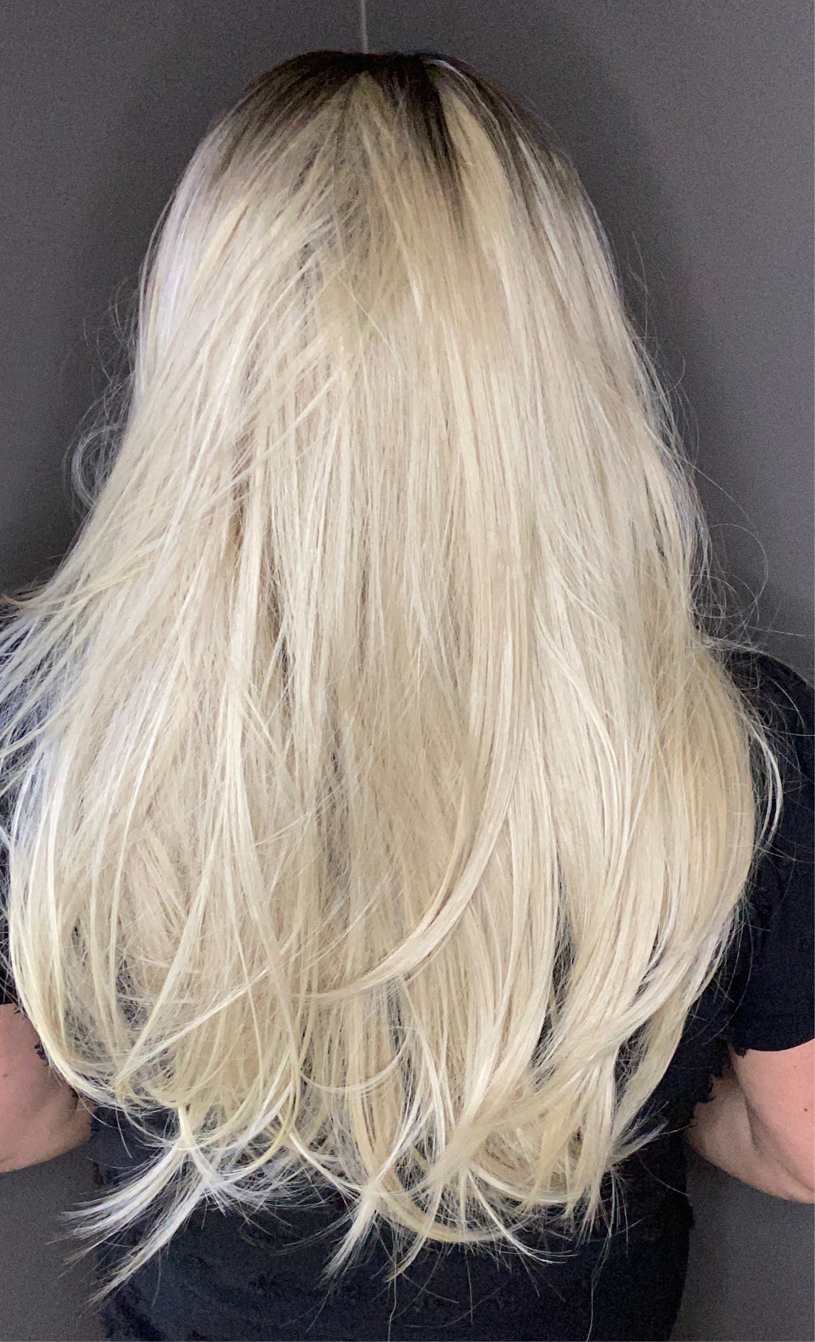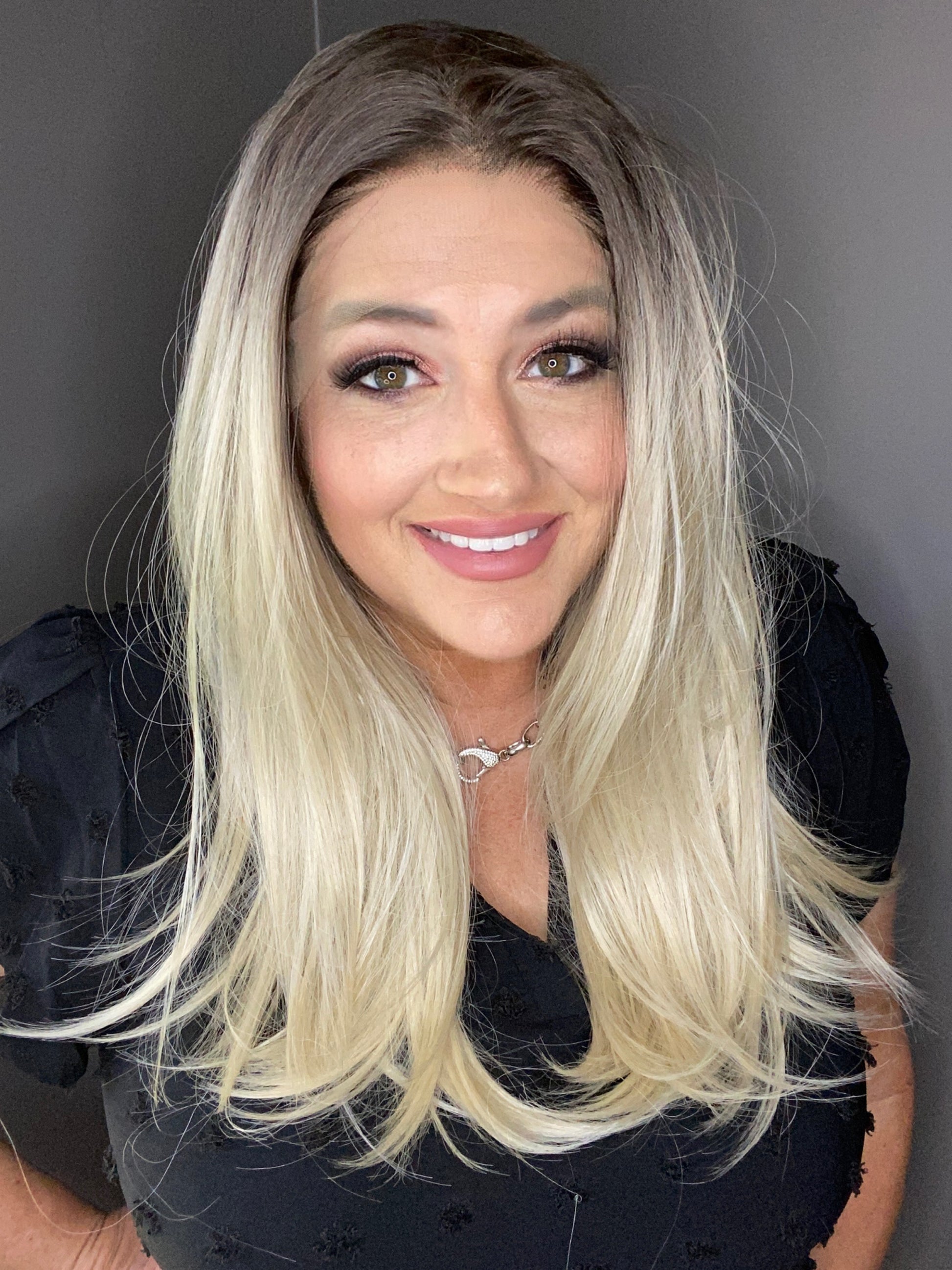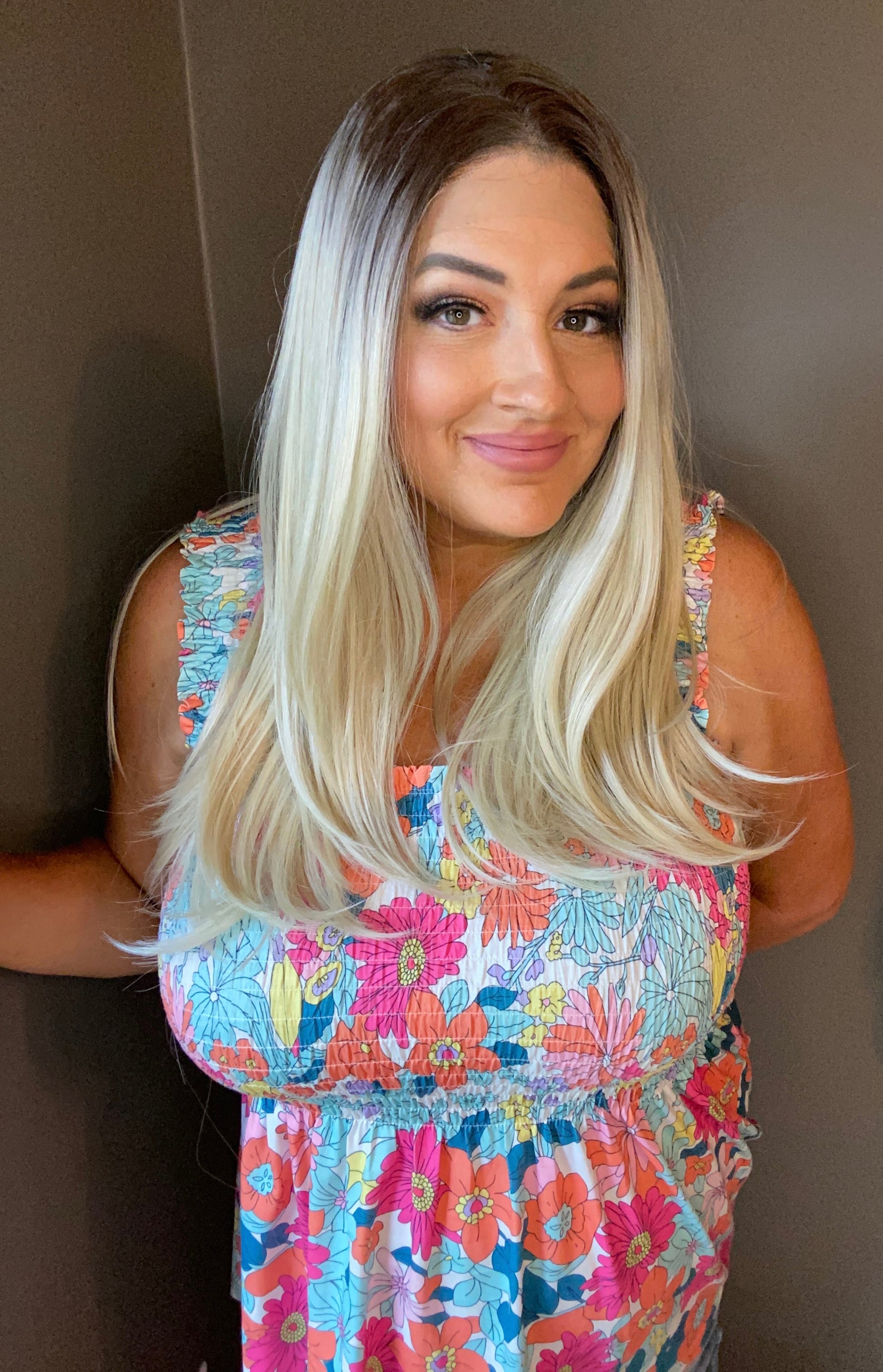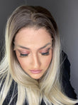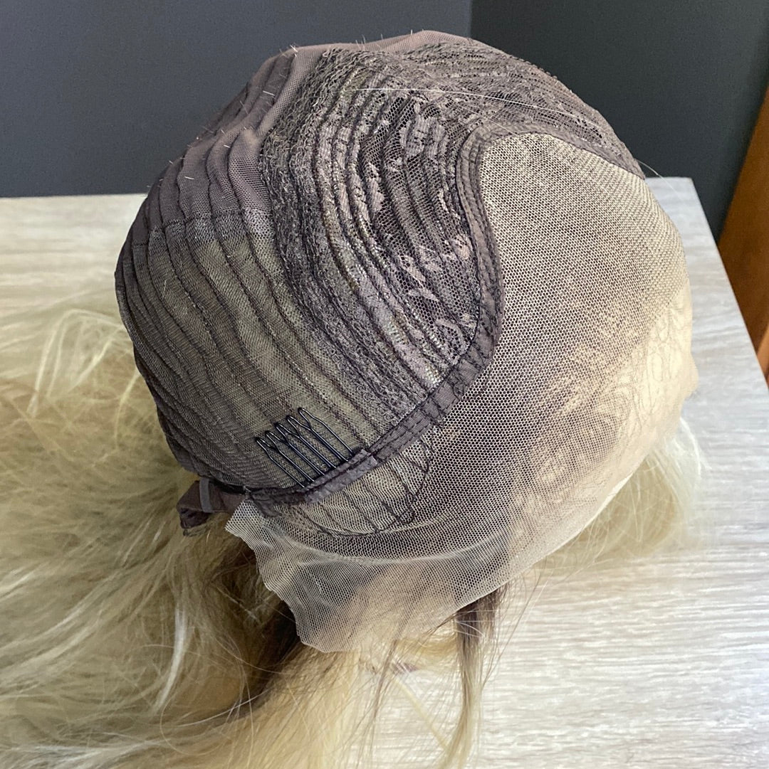 Dark blended root with 13x6 lace front provides a realistic hairline. 22 inches long blonde heat synthetic fiber hair can be curled using heat up to 325 degrees. Closed weft cap, adjustable straps and added combs for security. Fits head sizes up to 22 inches.