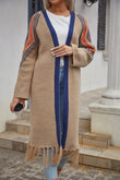 Double Take Geometric Fringe Hem Open Front Duster Cardigan