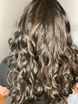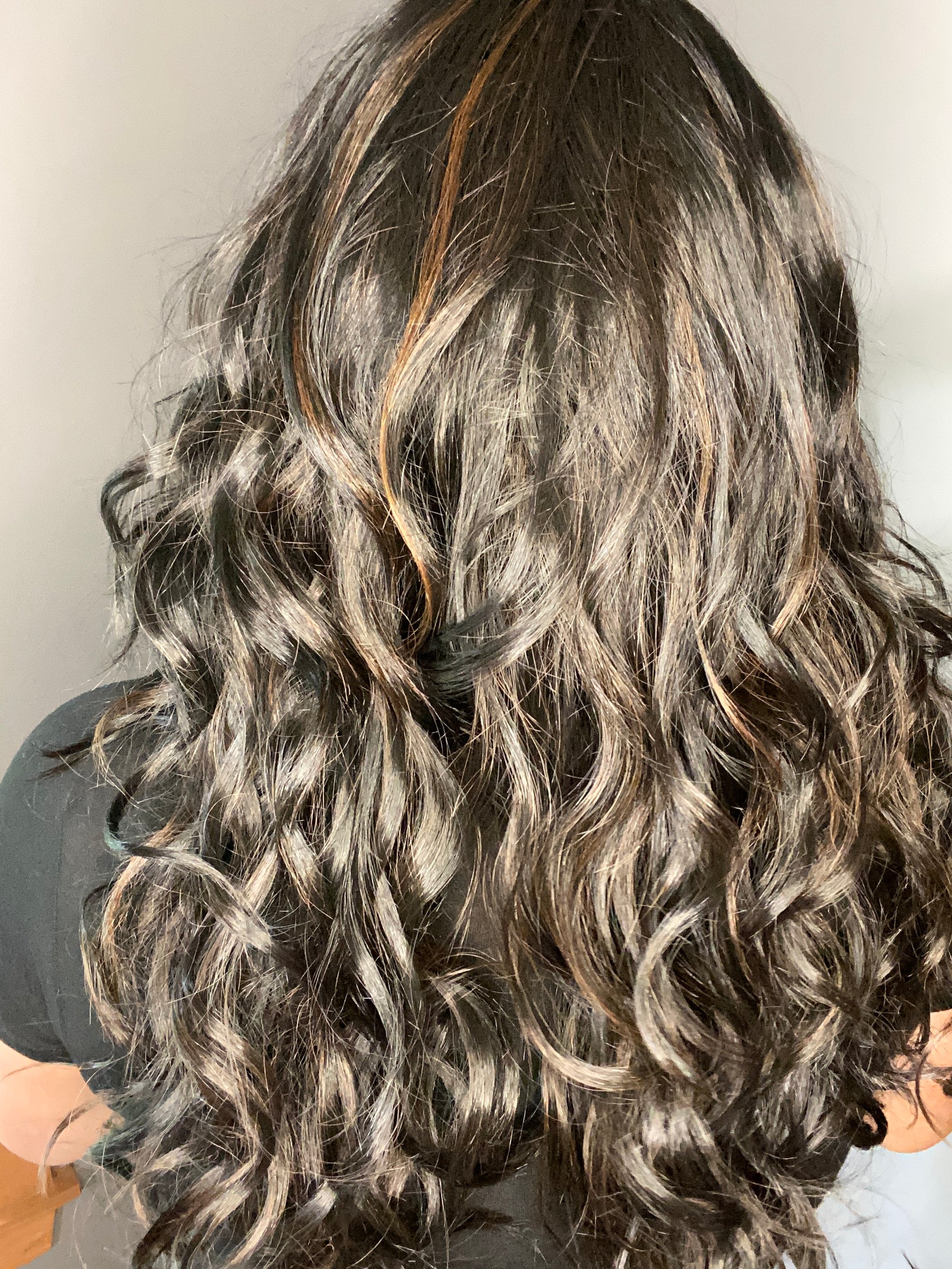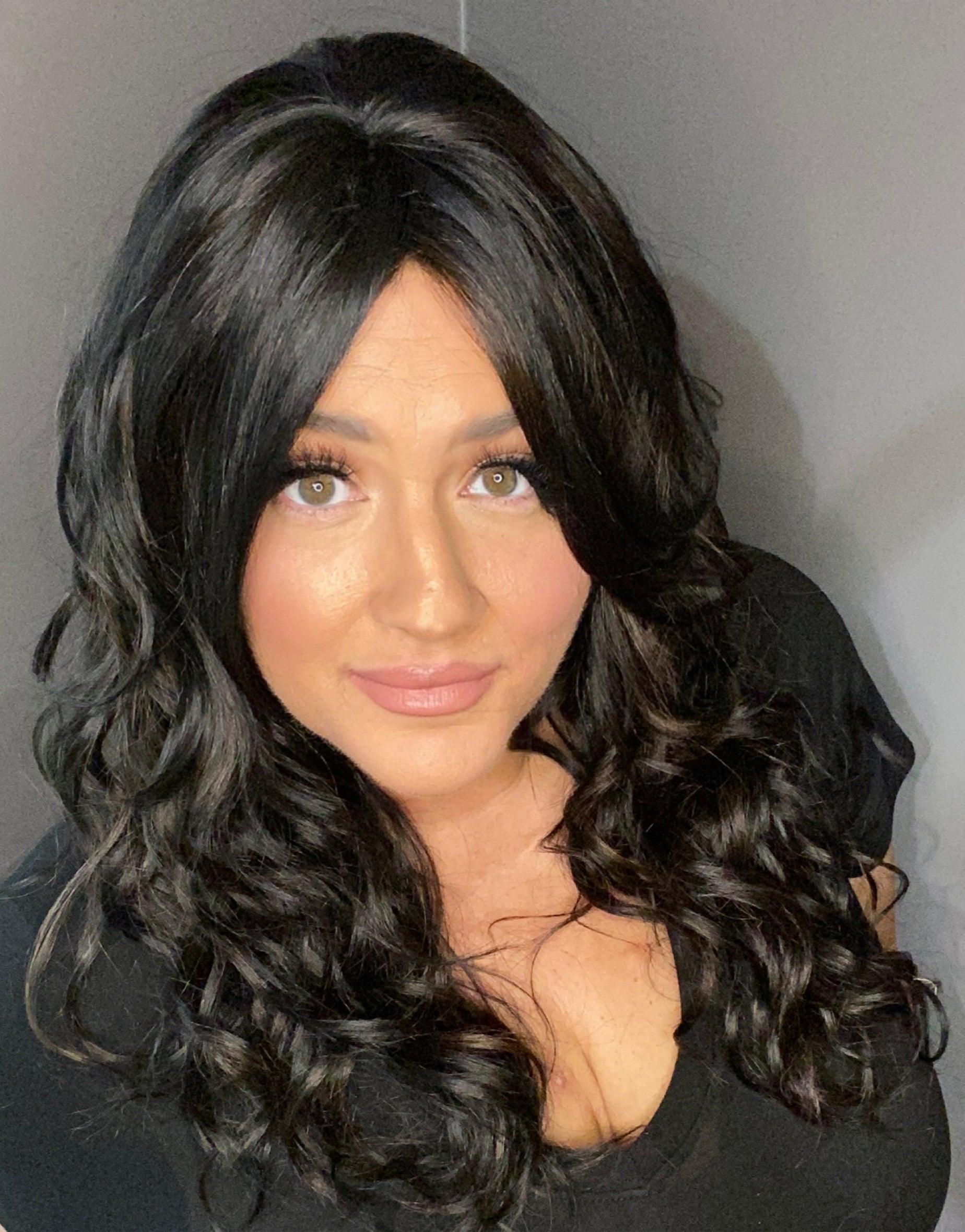 Gabby by Sepia in  Black with very subtle warm highlights.  Perfect curl pattern and curtain bangs! Heat friendly synthetic fiber. 130% density, open weft making it perfect for the summer heat. Smaller size cap, fits up to 22 inches.