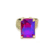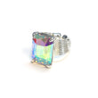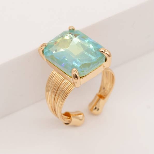 Stunning cocktail ring features one large rectangular emerald cut glass crystal on a adjustable wired style band.