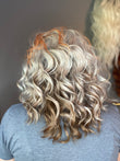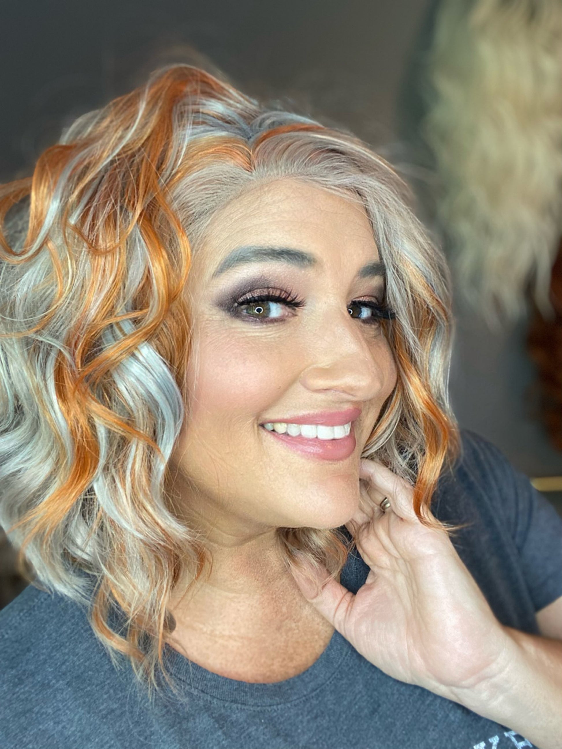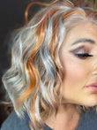 Classy silver strands hug the pumpkin spice highlights through this wave style!